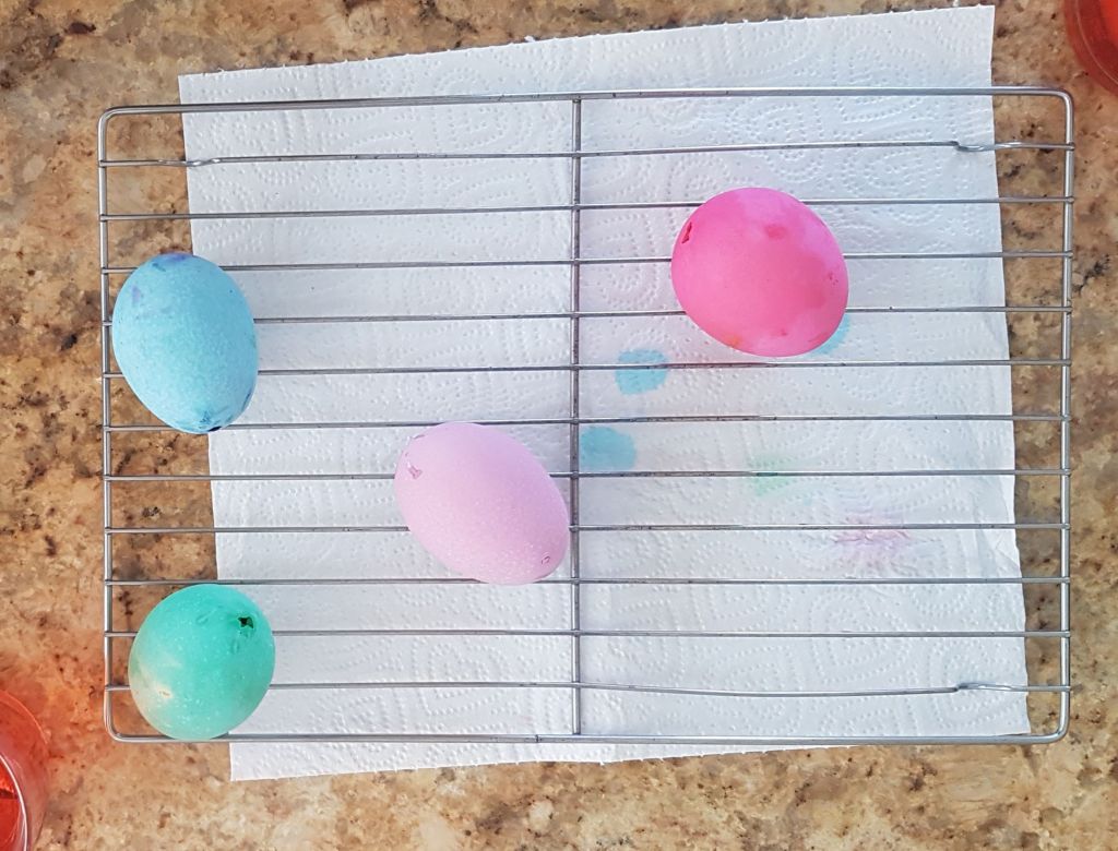 When you’re satisfied with the colour on your eggs, place them on a cooling rack positioned over some kitchen paper to allow them to dry.