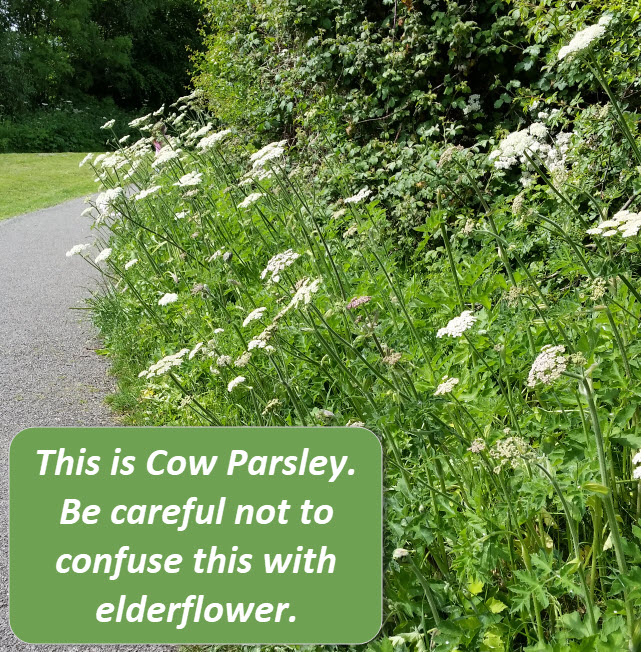 IMPORTANT! Hemlock is a highly poisonous plant that grows on a green stalk (with purple blotches) directly from the ground, and looks something similar to the cow parsley pictured above. Do not confuse hemlock and elderflower!