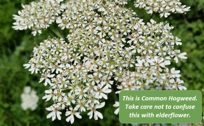 The above picture is NOT elderflower. This is Common Hogweed. Note that the flowers do not have 5 rounded petals – instead the petals are somewhat ragged and lack the white stamens and yellow anthers of elderflower. Common Hogweed also grows on stalks directly from the ground, whereas Elderflower grows on the woody branches of the elder tree.